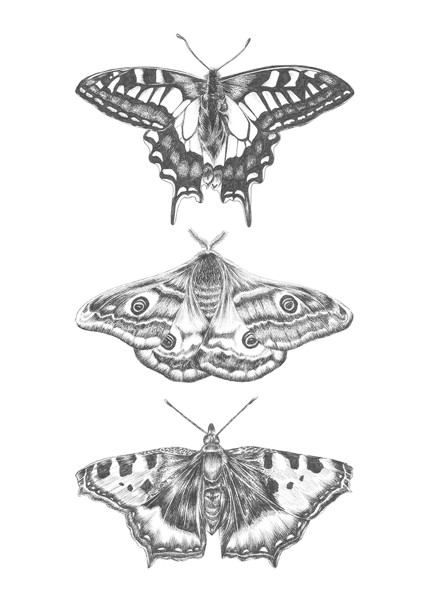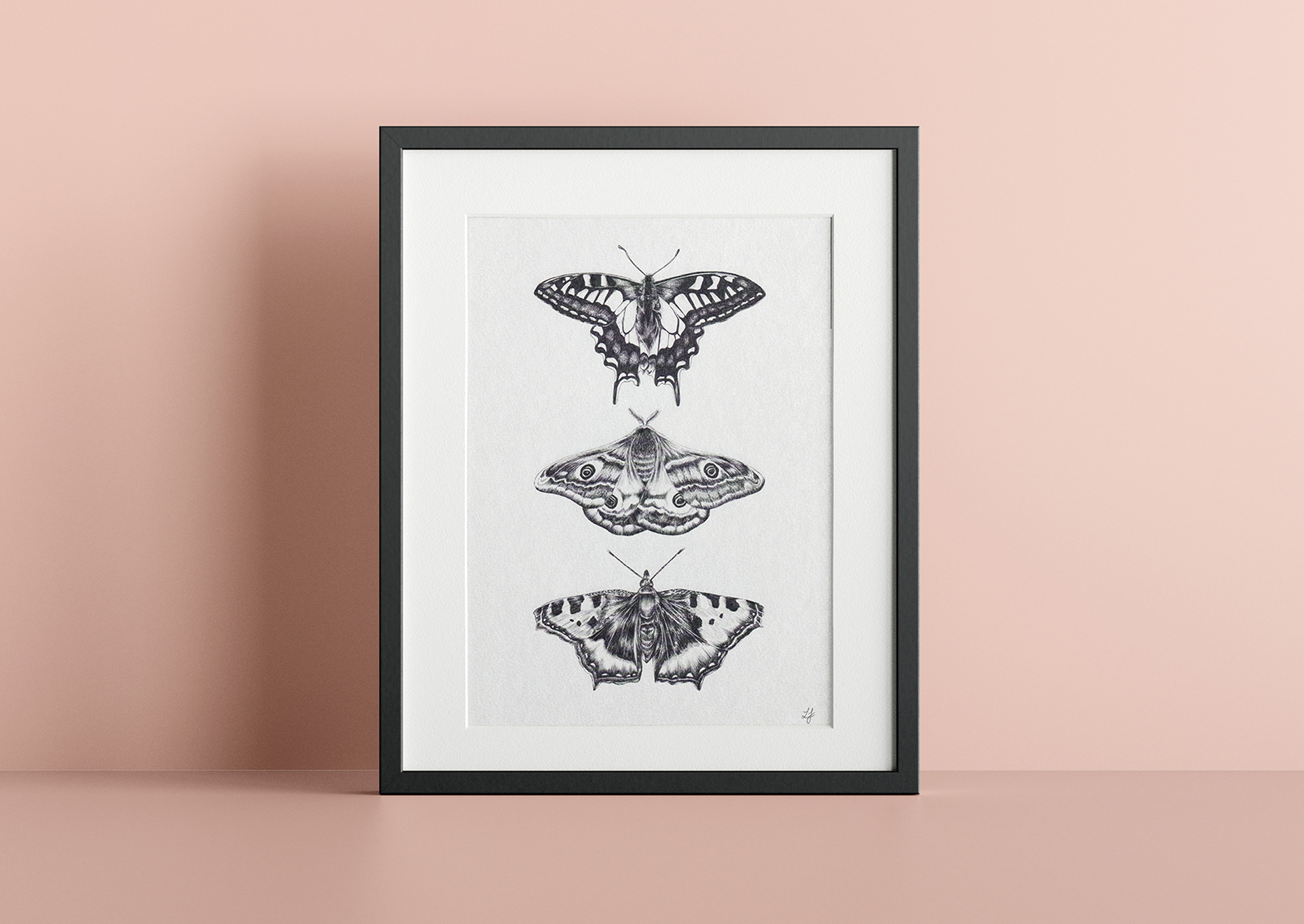Artworks drawn with archival pigmented ink fineliner pens, on fine grain heavyweight paper.