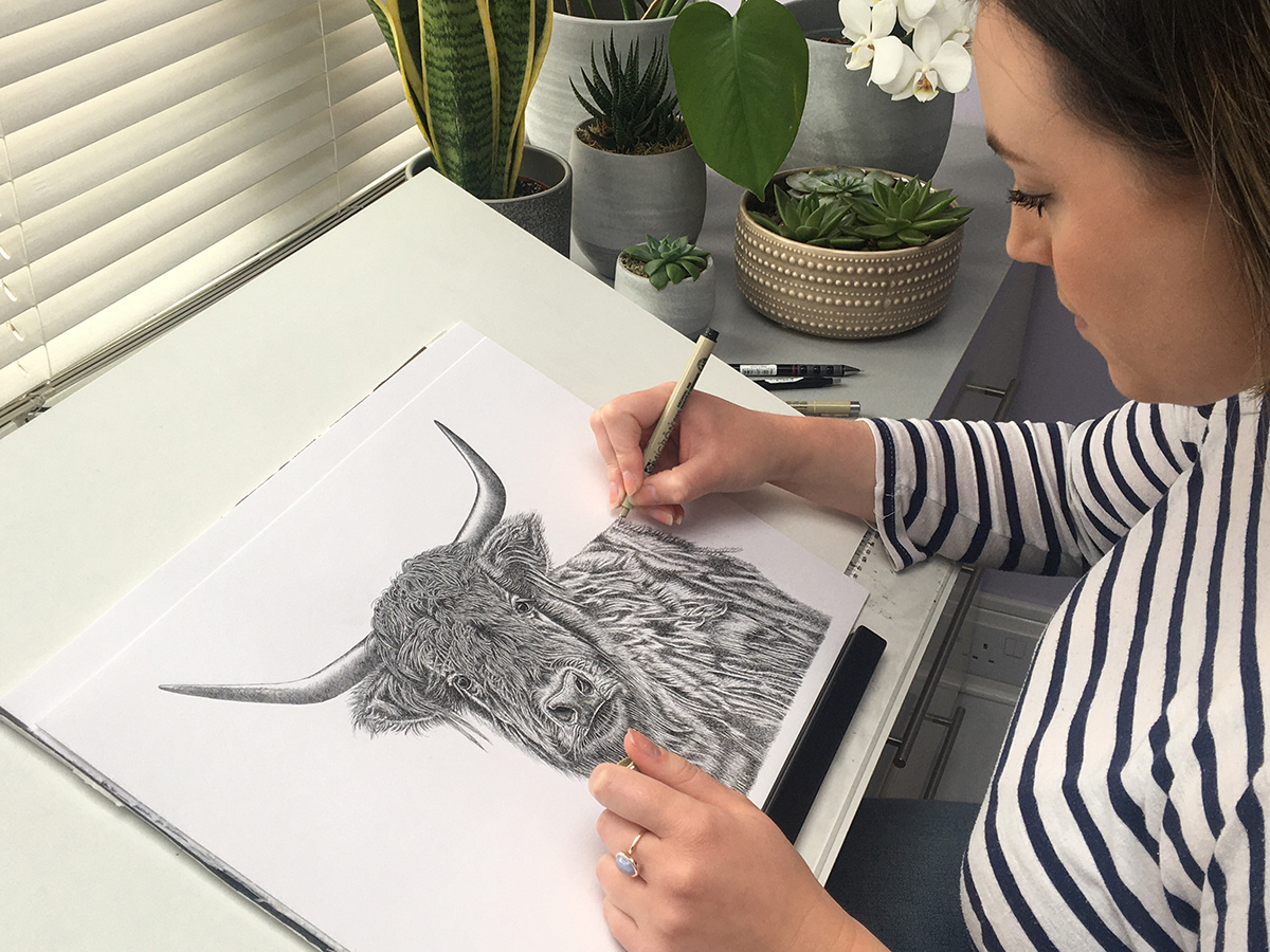Artworks drawn with archival pigmented ink fineliner pens, on fine grain heavyweight paper.