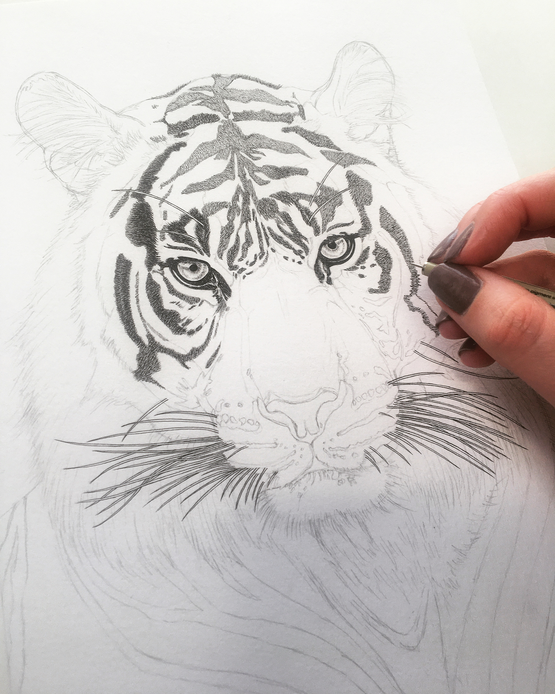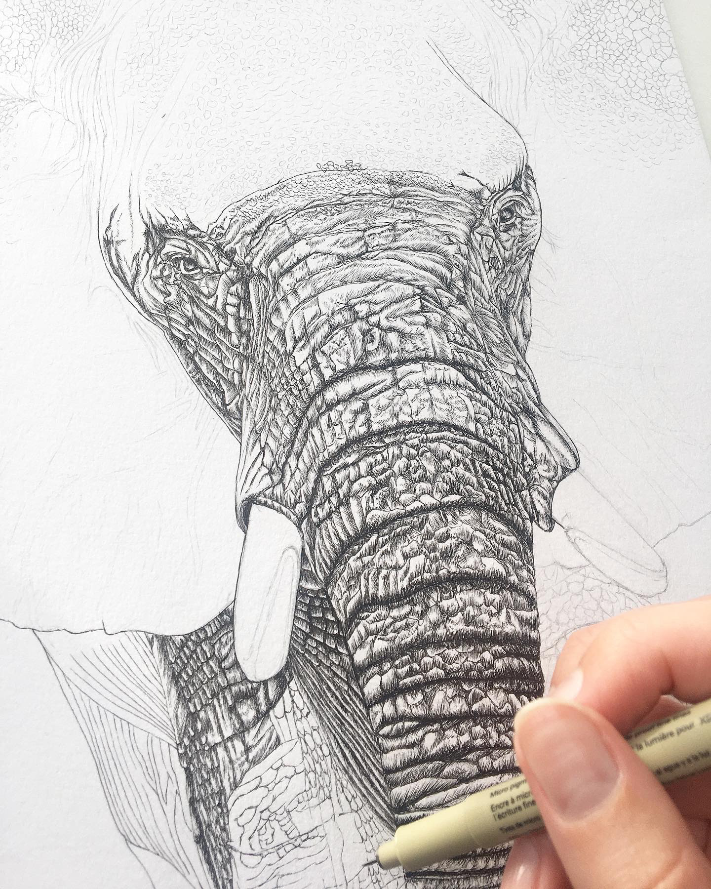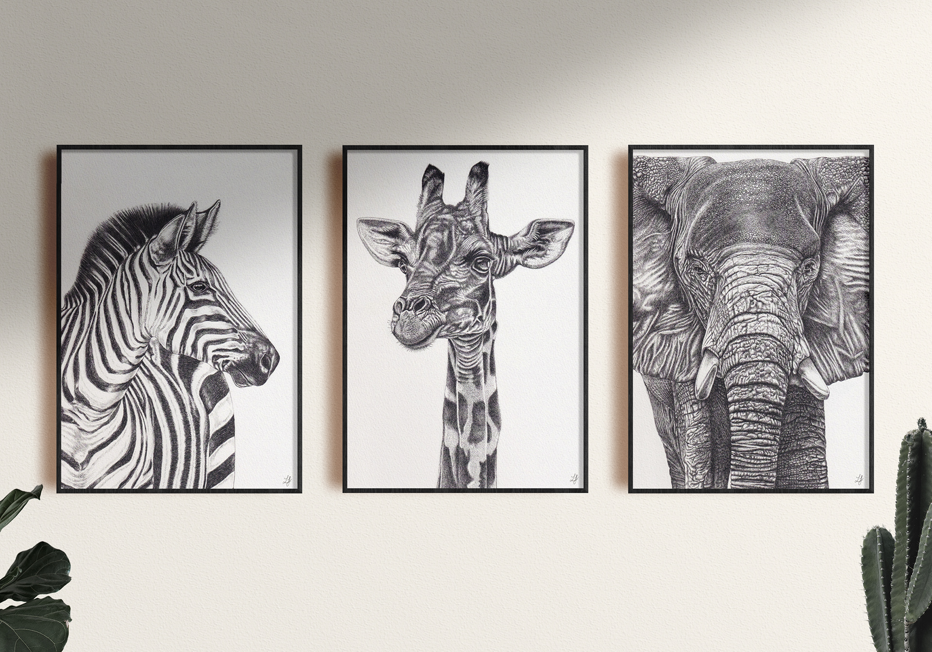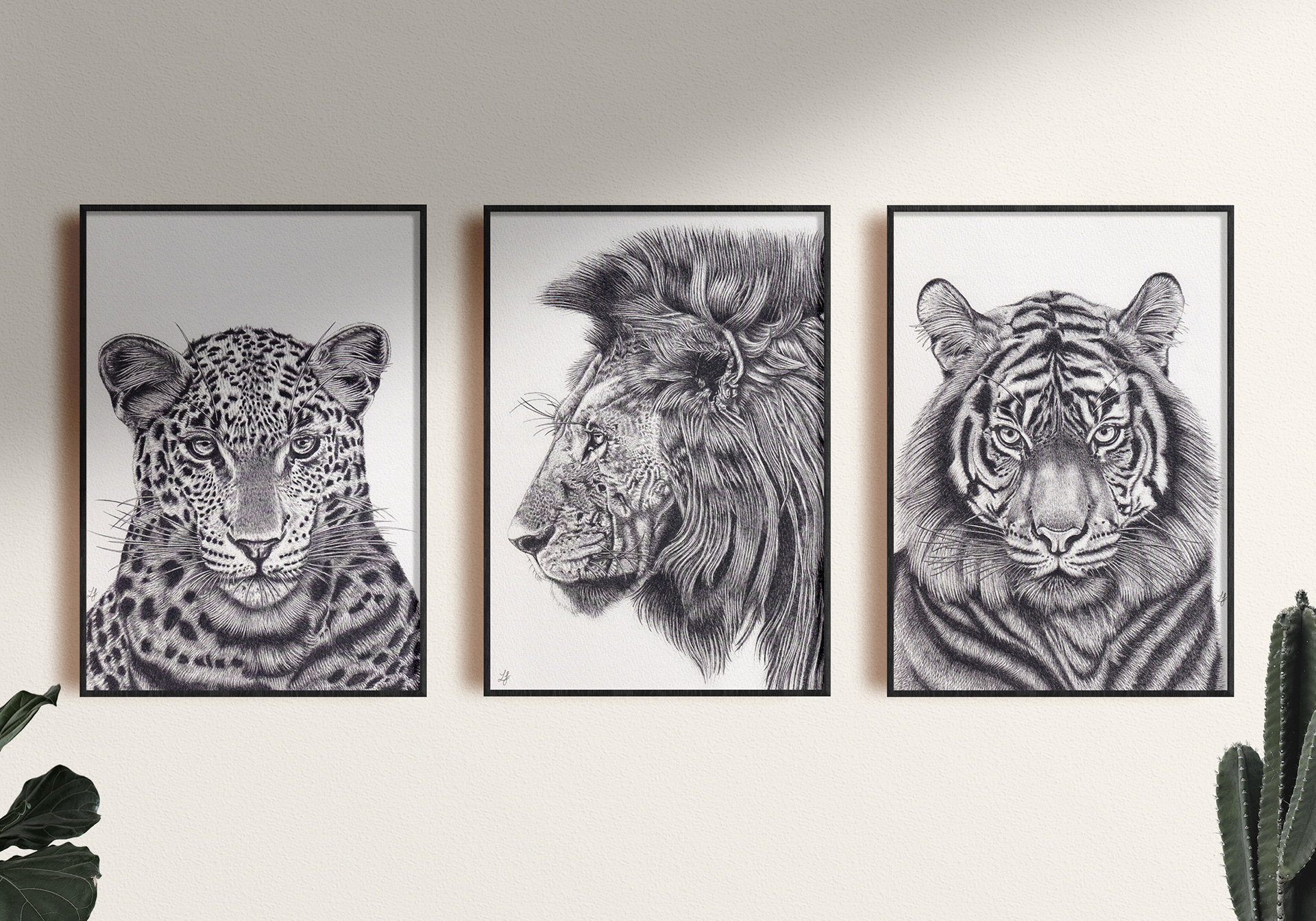 Artworks drawn with archival pigmented ink fineliner pens, on fine grain heavyweight paper.